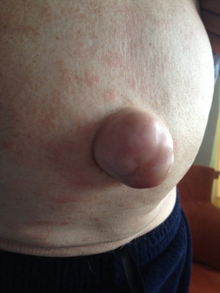 - Nontender mass that returns to the peritoneal cavity with mild, externally applied pressure