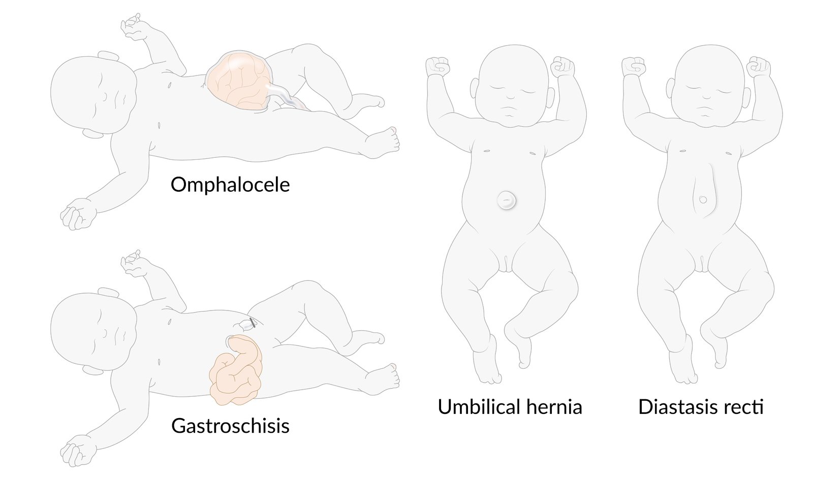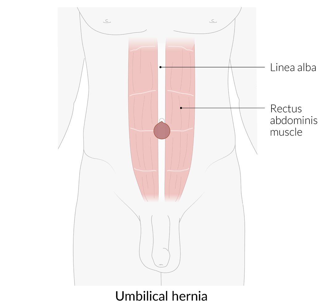 - Umbilical hernia: midline ventral hernia at the level of the umbilicus [3][4]