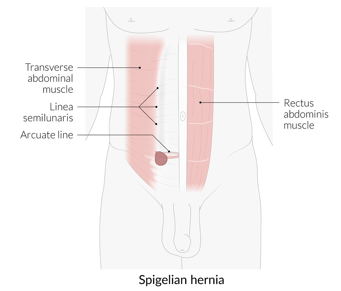 - Spigelian hernia: herniation along the semilunar line; commonly adjacent to the arcuate line (i.e., below the umbilicus) [6][7]