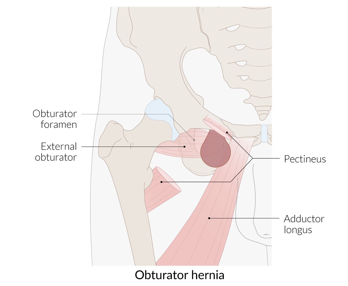 - Obturator hernia: pain and paresthesia in the pelvis and inner thigh, episodic intestinal obstruction