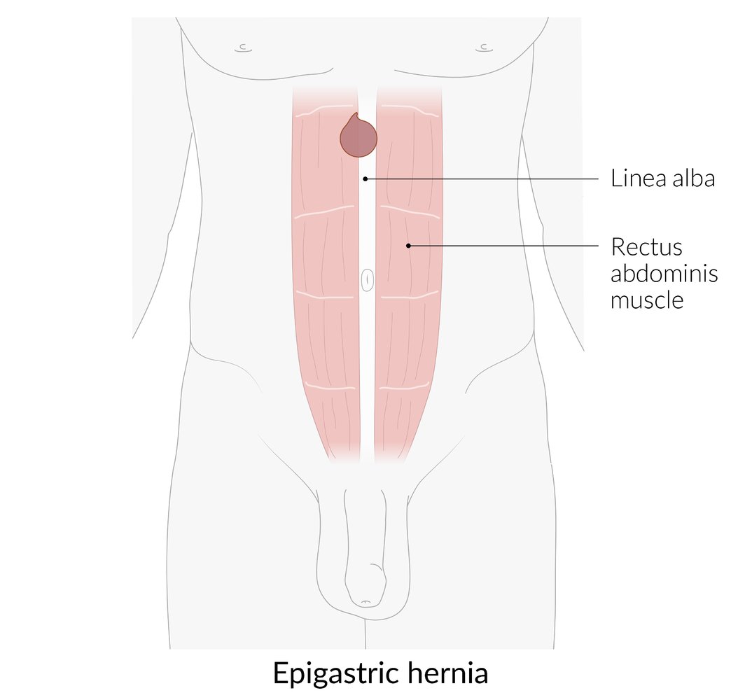 - Epigastric hernia: protrusion of intraabdominal contents through the linea alba, between the xiphoid process and the umbilicus
