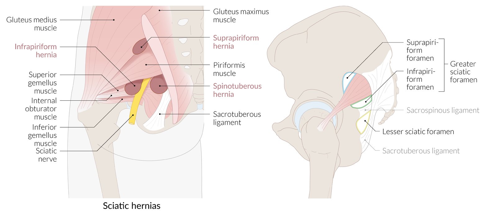 - Sciatic hernia: herniation through the greater sciatic foramen or lesser sciatic foramen