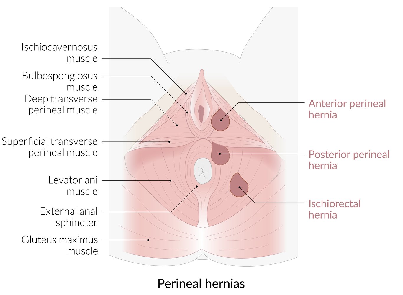 - Perineal hernia: pelvic pain, mass on rectovaginal examination