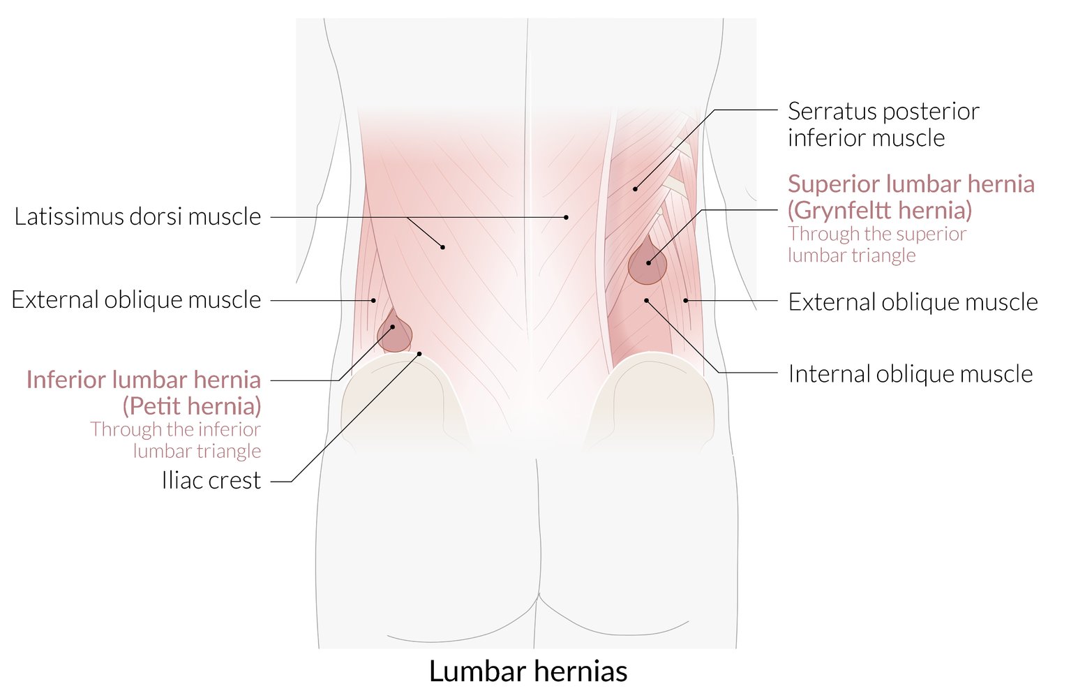 - Superior lumbar hernia: herniation through the superior lumbar triangle