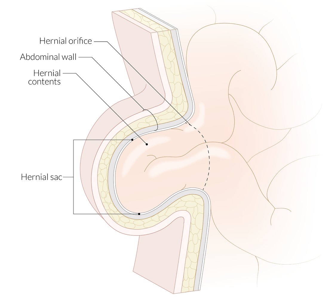 Abdominal hernias are a protrusion of intraabdominal contents through a congenital or acquired defect in the abdominal wall. Abdominal hernias are broadly classified by location (anterior wall, lateral wall, groin, or pelvis) and presentation (reducible, irreducible, obstructed, or strangulated). Physiological states that increase intraabdominal pressure (e.g., ascites, pregnancy, obesity, intraabdominal tumors, chronic cough) increase the risk of developing an abdominal hernia. Clinical presentation ranges from an asymptomatic mass in reducible hernias, to pain, bowel obstruction, and systemic symptoms in strangulated hernias. Abdominal hernias are typically a clinical diagnosis made on physical examination. Imaging (e.g., ultrasound, CT scan) may be used if the examination is difficult or atypical, and before surgery. Treatment is primarily surgical repair with or without a mesh, though observation may be adequate in some patients. Emergency surgery is always required for an obstructed or strangulated (i.e., ischemic) hernia. Congenital umbilical hernias typically close spontaneously by 5 years of age and have a wide neck, and the risk of complications is low; surgical intervention is rarely necessary.