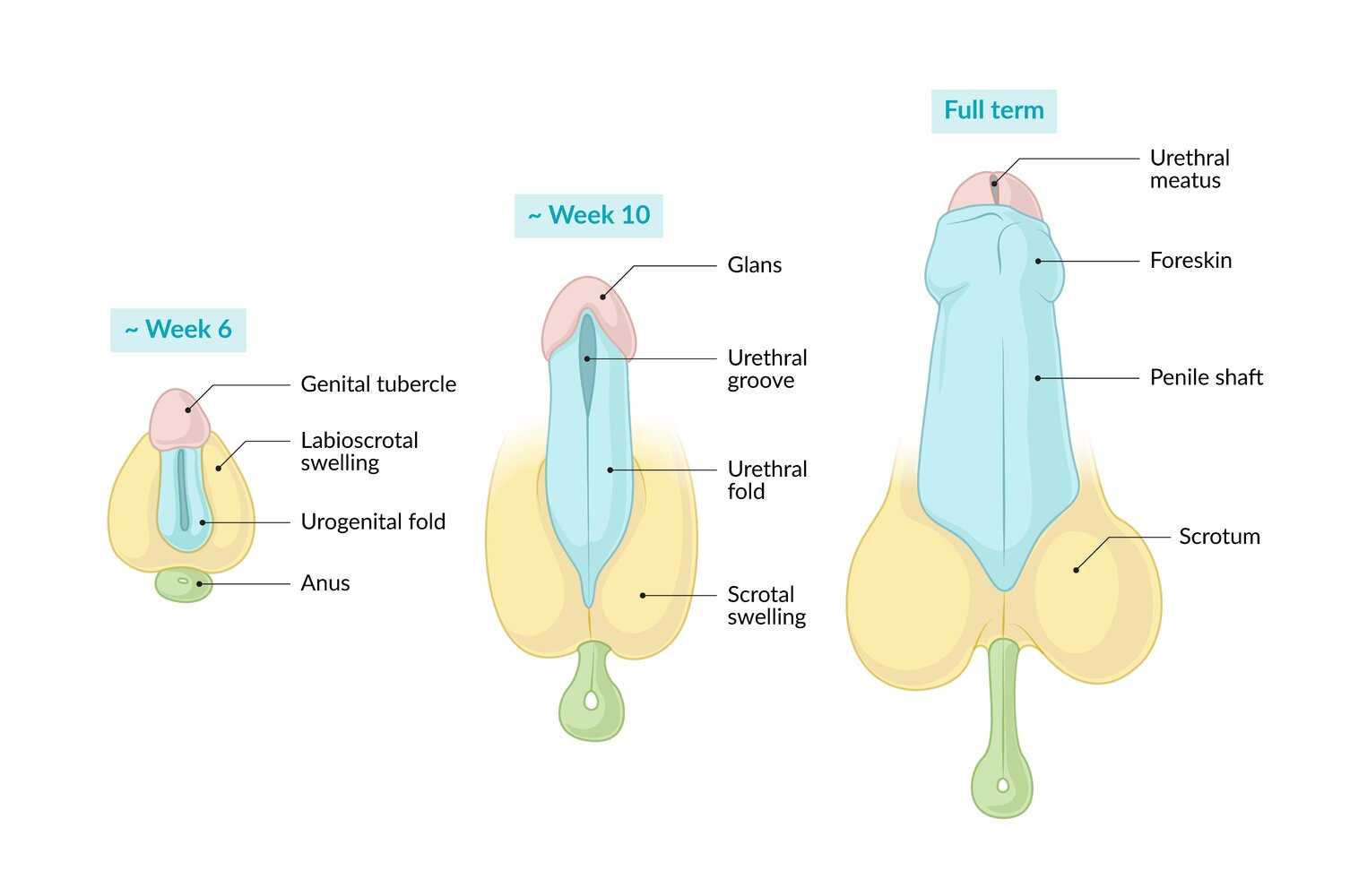 - Formation of webbing between the tip of the penis and the scrotum when erect
