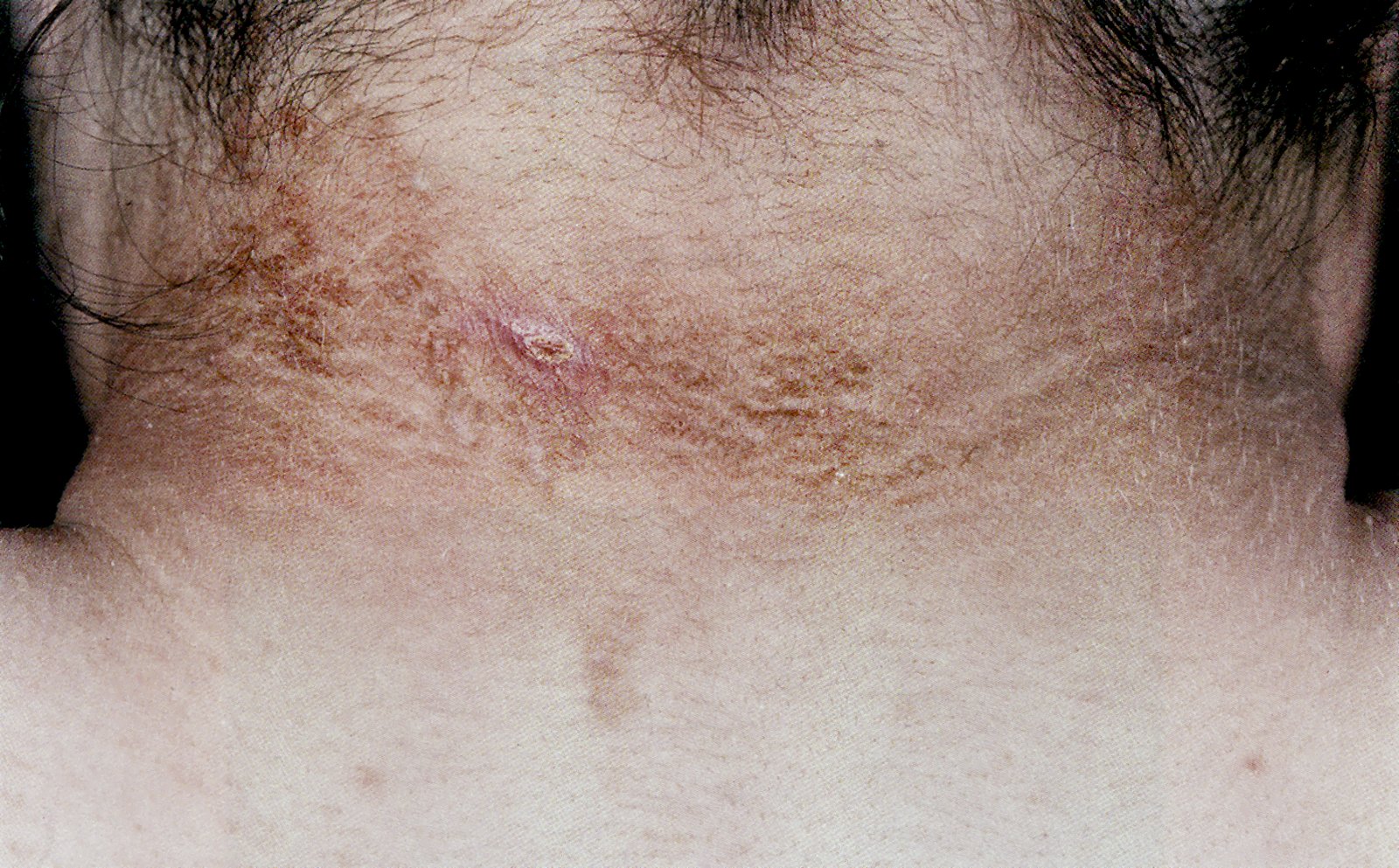 - Typically affects intertriginous areas (e.g., axillae, groin) and/or the back of the neck