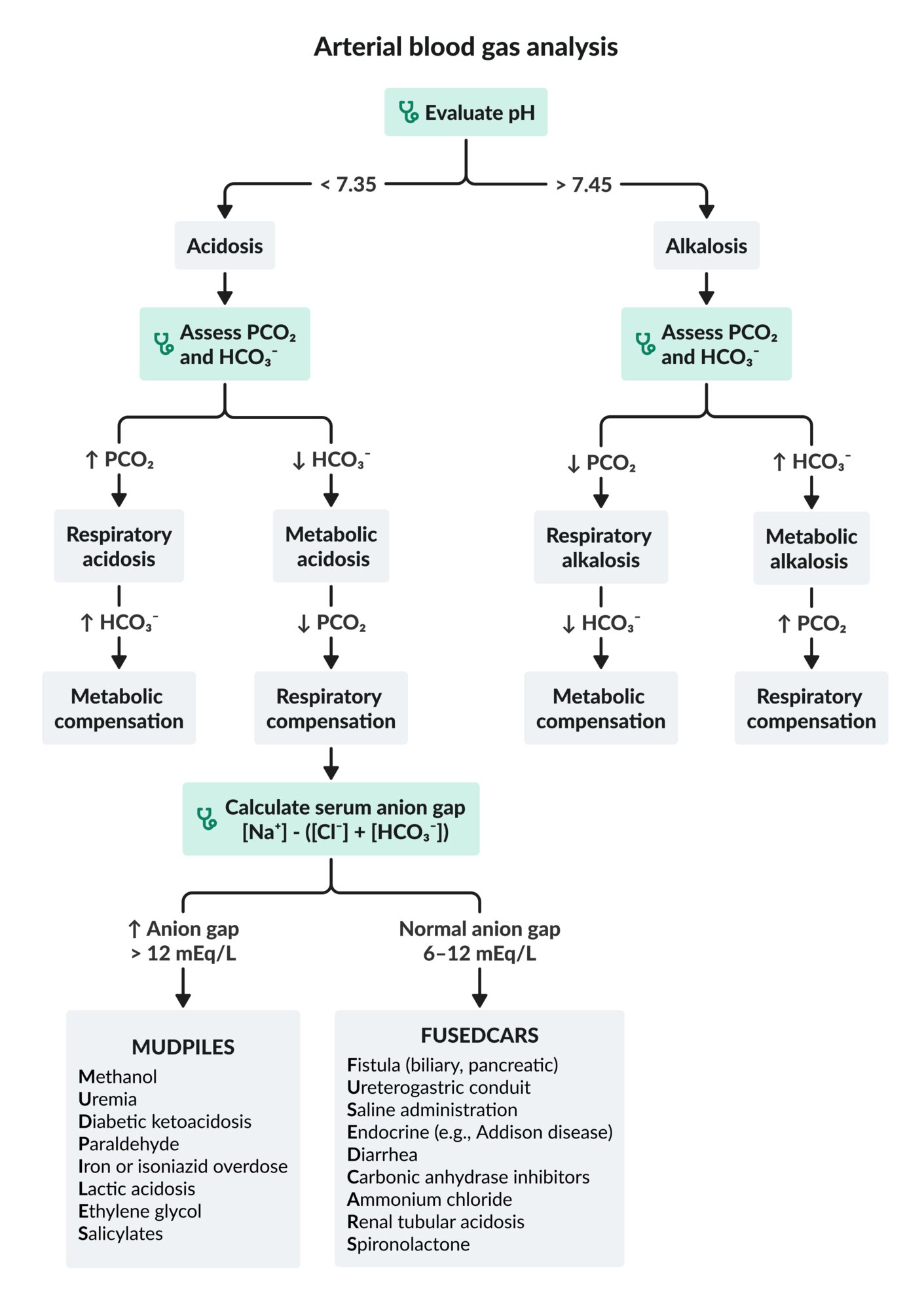 - High anion gap: increased concentration of organic acids such as lactate, ketones (e.g., beta-hydroxybutyrate, acetoacetate), oxalic acid, formic acid, or glycolic acid, with no compensatory increase in Cl-.
