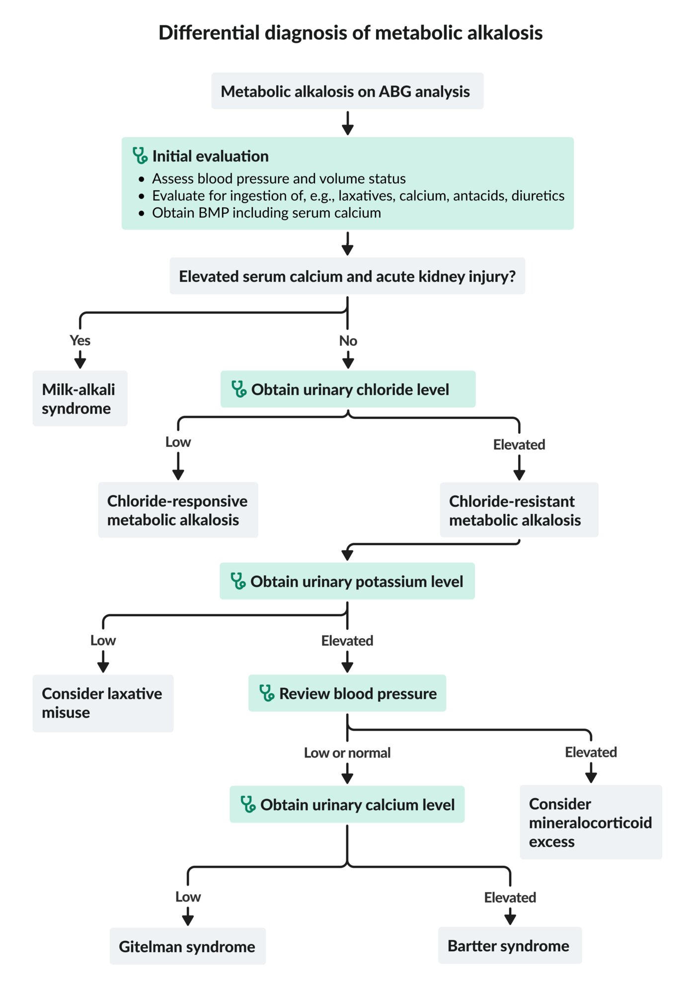 - Evaluate for exogenous ingestion (e.g., laxatives, calcium, alkali load, diuretics).