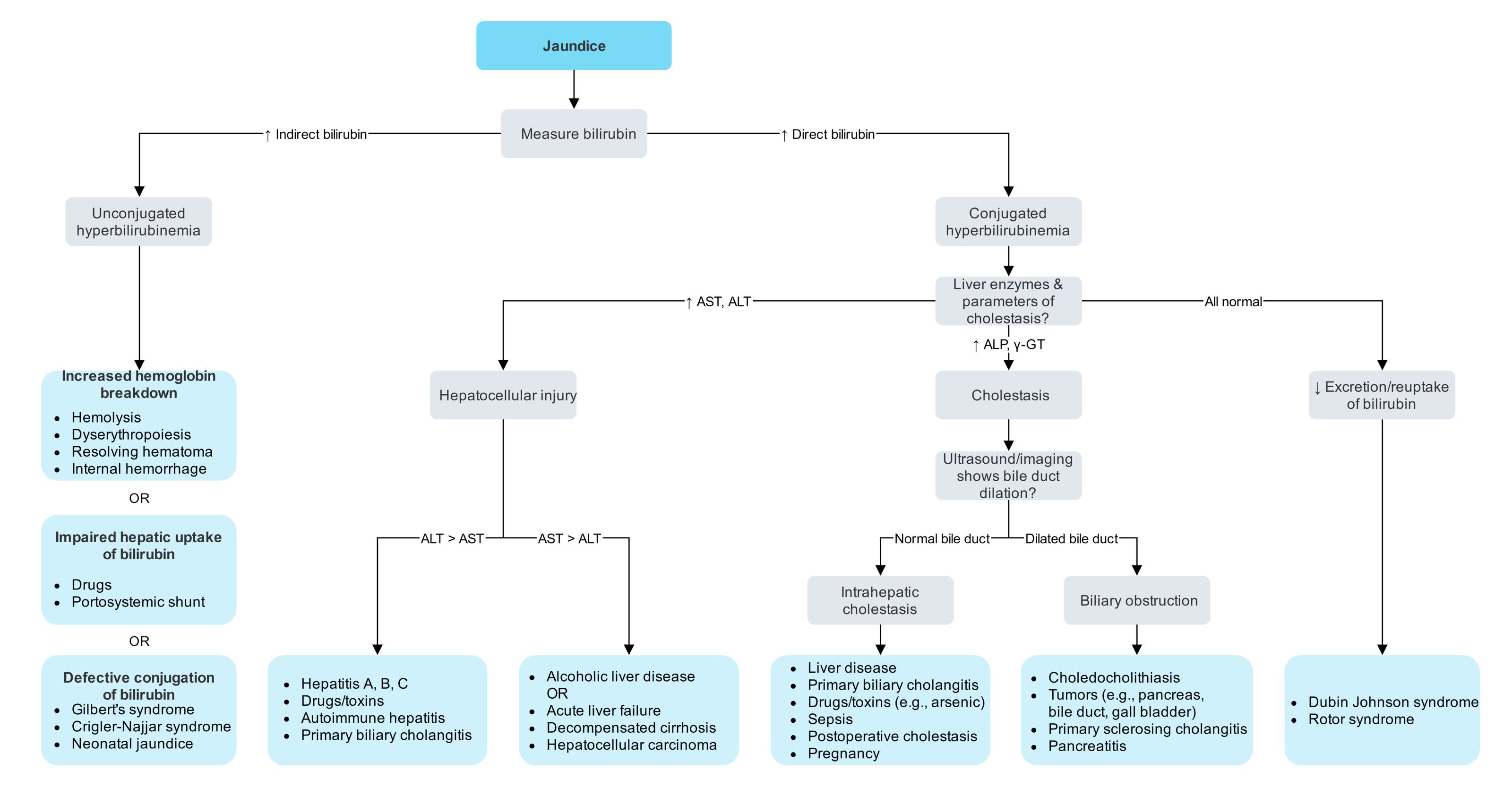 Differential diagnoses: acute on chronic liver disease, acute liver injury, sepsis, hypoperfusion-related liver injury, metabolic disorders