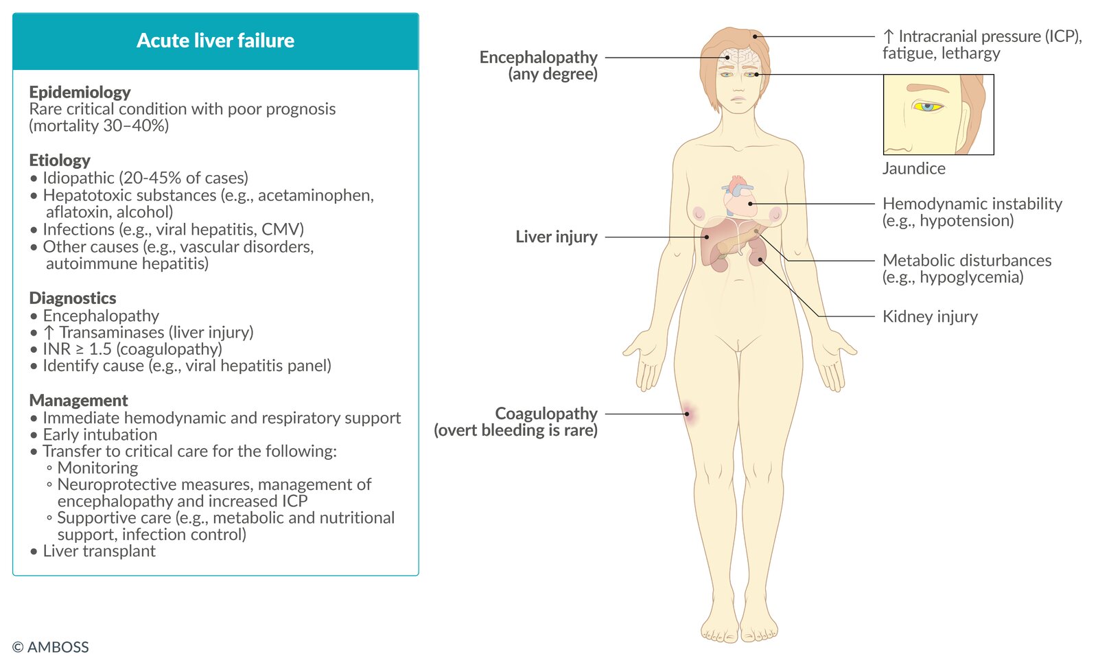 Acute liver failure (ALF) is a severe condition characterized by rapidly progressive liver injury, hepatic encephalopathy, and impaired synthetic function, which results in coagulopathy. The most common causes are infections (e.g., viral hepatitis) and acetaminophen toxicity. Signs of hepatic encephalopathy may be accompanied by jaundice and nonspecific symptoms such as nausea, vomiting, and fatigue. The diagnosis is confirmed by identifying an elevation of liver chemistries and an altered coagulation panel in patients with encephalopathy. Clinicians should maintain a high index of suspicion and aim to confirm the diagnosis as quickly as possible in order to start management early. Most patients with ALF are critically ill and require admission to a critical care unit. The prognosis is usually poor, and most patients require urgent liver transplantation as definitive treatment.