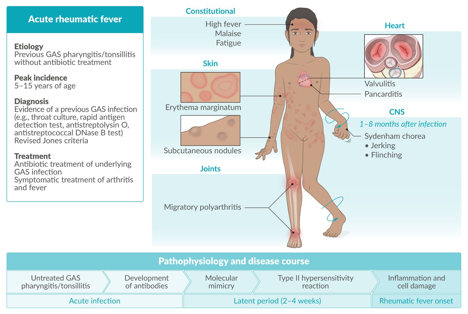 Acute rheumatic fever (ARF) is an inflammatory sequela involving the heart, joints, skin, and central nervous system (CNS) that occurs two to four weeks after an untreated group A β‑hemolytic streptococcal infection (GAS). The pathogenic mechanisms that cause rheumatic fever are not completely understood, but molecular mimicry between streptococcal M protein and human cardiac myosin proteins is thought to play a role. Because of the structural similarities between the two proteins, antibodies and T cells activated to respond to streptococcal proteins also react with the human proteins, causing tissue injury and inflammation. In addition to nonspecific symptoms (e.g., fever, malaise, and fatigue), patients present with symptoms involving the heart (carditis or valvulitis), joints (migratory polyarthritis), skin (subcutaneous nodules, erythema marginatum), and/or CNS (Sydenham chorea). The diagnosis of ARF is primarily clinical and based on the Jones criteria. Diagnostic evaluation in ARF typically shows elevated inflammatory markers, positive antistreptococcal antibodies, and valvular damage on echocardiogram. Treatment of ARF includes antibiotic therapy for GAS eradication, symptom-based treatment (e.g., for arthritis), and management of associated complications, which may include progressive, permanent damage to the heart valves (especially the mitral valve), resulting in chronic rheumatic heart disease (RHD). Long-term antibiotic prophylaxis and monitoring are recommended in all patients with ARF and RHD to prevent ARF recurrence and RHD progression.