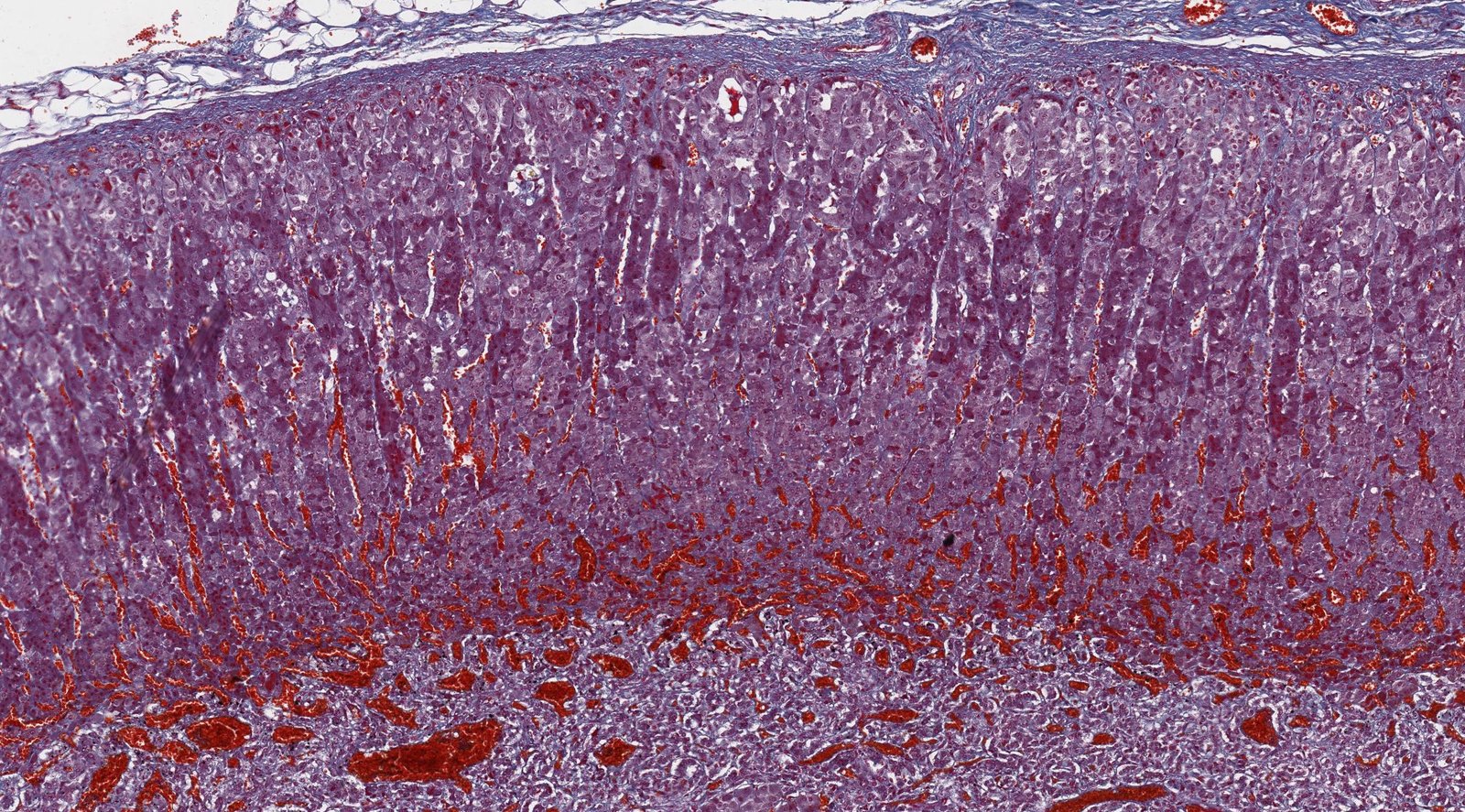 The adrenal gland is a paired retroperitoneal organ located on the upper pole of each kidney. It receives its arterial supply from the superior, middle, and inferior suprarenal arteries and drains into the right and left suprarenal veins. The lymphatics drain into the left aortic and the right caval lymph nodes. The adrenal gland has two layers: the adrenal cortex (outer layer), which is derived from the mesoderm, and the adrenal medulla (inner layer), which is derived from neural crest cells. The adrenal medulla is composed of chromaffin cells, which secrete catecholamines (norepinephrine, epinephrine, dopamine). The adrenal cortex consists of three layers: the zona glomerulosa, the zona fasciculata, and the zona reticularis, which are responsible for the synthesis of mineralocorticoids, glucocorticoids, and androgens (precursors for estrogen and testosterone), respectively. Mineralocorticoids regulate renal sodium and water reabsorption and potassium excretion, while glucocorticoids play an important role in glucose metabolism. Diseases of the adrenal glands include adrenal insufficiency (due to an infection, hemorrhage, or autoimmune destruction), hyperaldosteronism (due to hyperplasia or adenoma), and hypercortisolism (due to hyperplasia, adenoma, or exogenous administration).