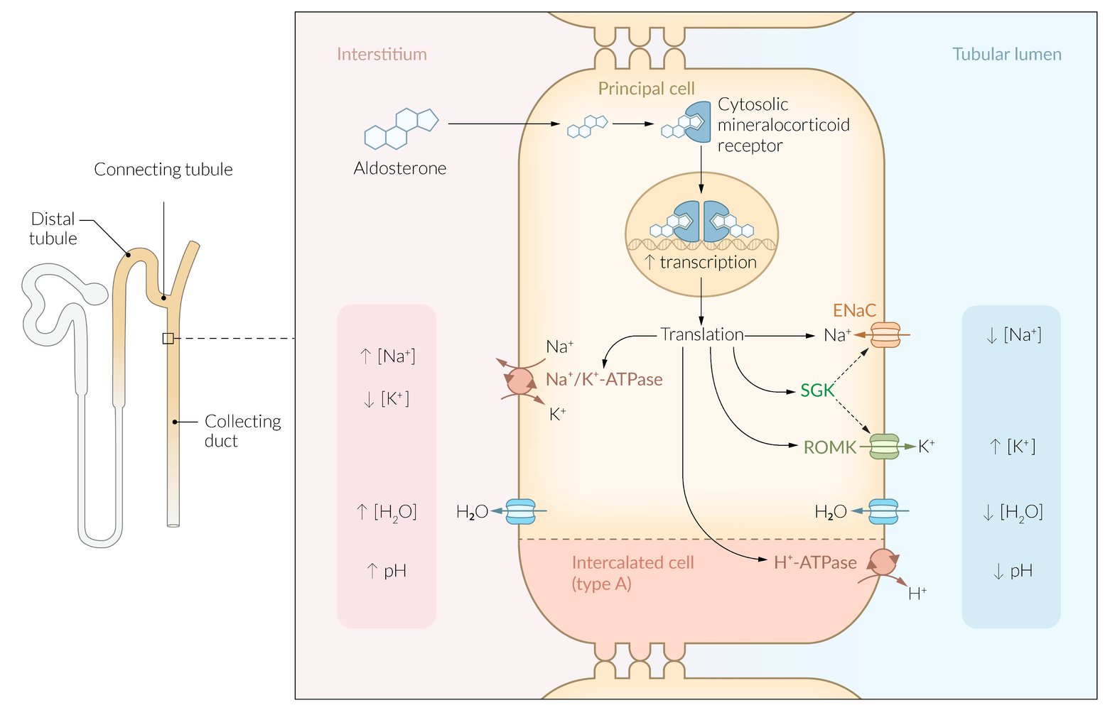 Mechanism of action: aldosterone binds to intracellular mineralocorticoidreceptors in the distal tubule and collecting duct of the kidney, inducing protein synthesis and following changes:
