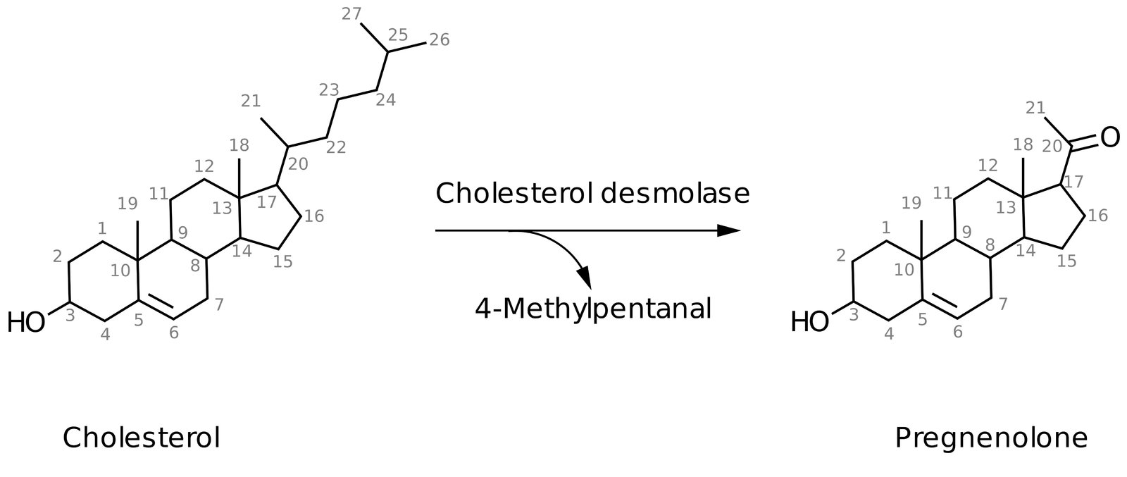 Synthesis of all steroid hormones begins with the common precursor molecule, cholesterol, which is converted into pregnenolone via cholesterol desmolase. Cholesterol desmolase can be inhibited by azole antifungals.