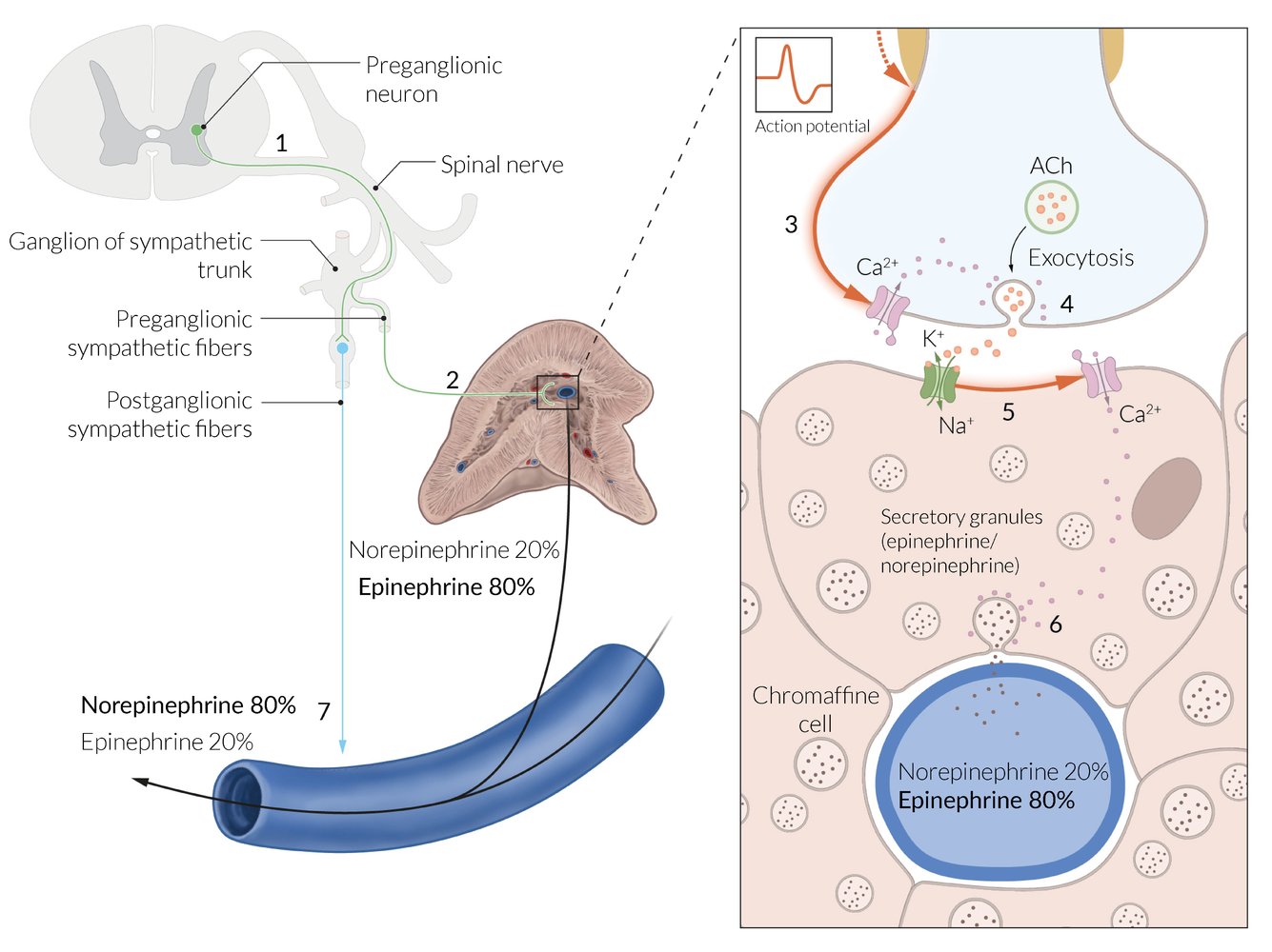 - Adrenal medulla: production of catecholamines (epinephrine, norepinephrine)