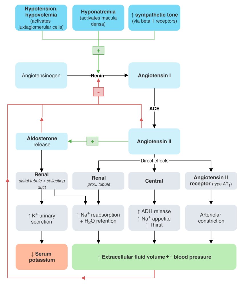 - Important target for blood pressure medication (e.g., ACE inhibitors, AT1 blockers, diuretics) and involved in the development of cardiac conditions (e.g., congestive heart failure, cardiac remodeling)