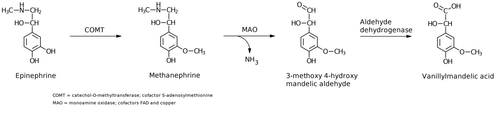 - Vanillylmandelic acid (VMA) is an end-stage metabolite. Urinary excretion is elevated in patients with pheochromocytoma and neuroblastoma.