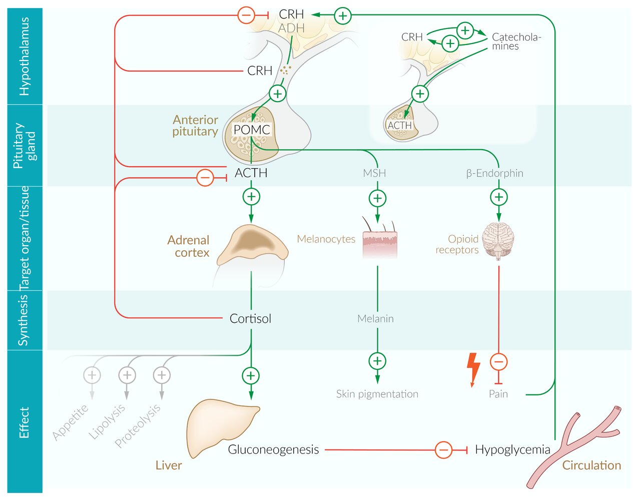 - β ACTH β β production of POMC (in order to increase ACTH production) β β melanocyte-stimulating hormone (MSH) β hyperpigmentation of the skin (bronze skin) [11]