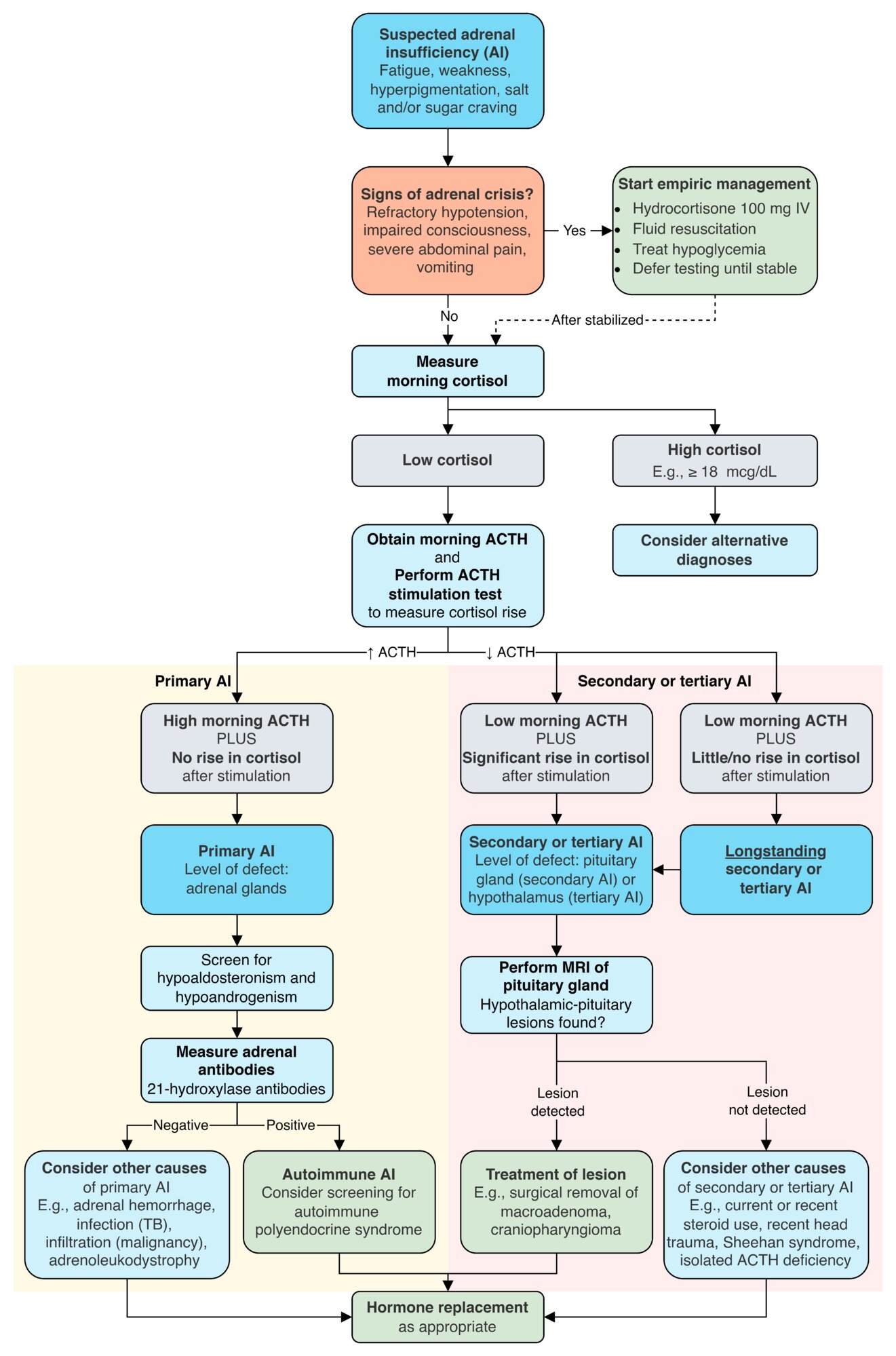 Chronic adrenal insufficiency: Use stepwise endocrine testing in all patients.