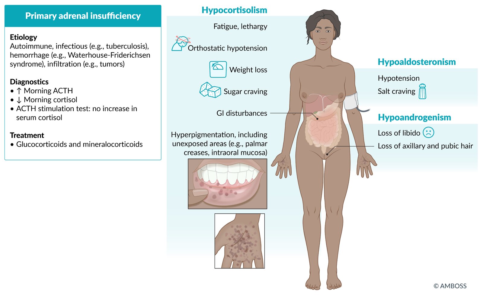 Adrenal insufficiency is the decreased production of adrenocortical hormones (glucocorticoids, mineralocorticoids, and adrenal androgens) and is classified as primary, secondary, or tertiary. Primary adrenal insufficiency (Addison disease) is caused by a disorder of the adrenal glands. The most frequent cause of primary adrenal insufficiency in the US by far is autoimmune adrenalitis, which can occur sporadically or as a manifestation of polyglandular autoimmune syndromes. Secondary adrenal insufficiency is the result of decreased production of ACTH (adrenocorticotropic hormone) and tertiary adrenal insufficiency is the result of decreased production of CRH (corticotropin-releasing hormone) by the hypothalamus. Decreased levels of ACTH or CRH are seen following sudden cessation of prolonged glucocorticoid therapy and in pituitary/hypothalamic diseases. Patients with long-standing adrenal insufficiency can present with postural hypotension, nausea, vomiting, weight loss, anorexia, lethargy, depression, and/or chronic hyponatremia. There may also be a loss of libido as a result of hypoandrogenism. Patients with primary adrenal insufficiency tend to additionally develop hyperpigmentation of the skin, mild hyperkalemia, and metabolic acidosis. Serum cortisol levels that remain low even after the administration of exogenous ACTH (ACTH stimulation test) confirm the diagnosis of primary adrenal insufficiency. Glucocorticoid replacement therapy with hydrocortisone is required for all forms of adrenal insufficiency. The dose of glucocorticoids should be increased during periods of stress (e.g., surgery, trauma, infections) in order to prevent adrenal crisis, which is a severe, acute type of adrenal insufficiency that manifests with shock, fever, impaired consciousness, and severe abdominal pain. Adrenal crisis is life-threatening and should be treated immediately with high doses of hydrocortisone and intravenous fluids.