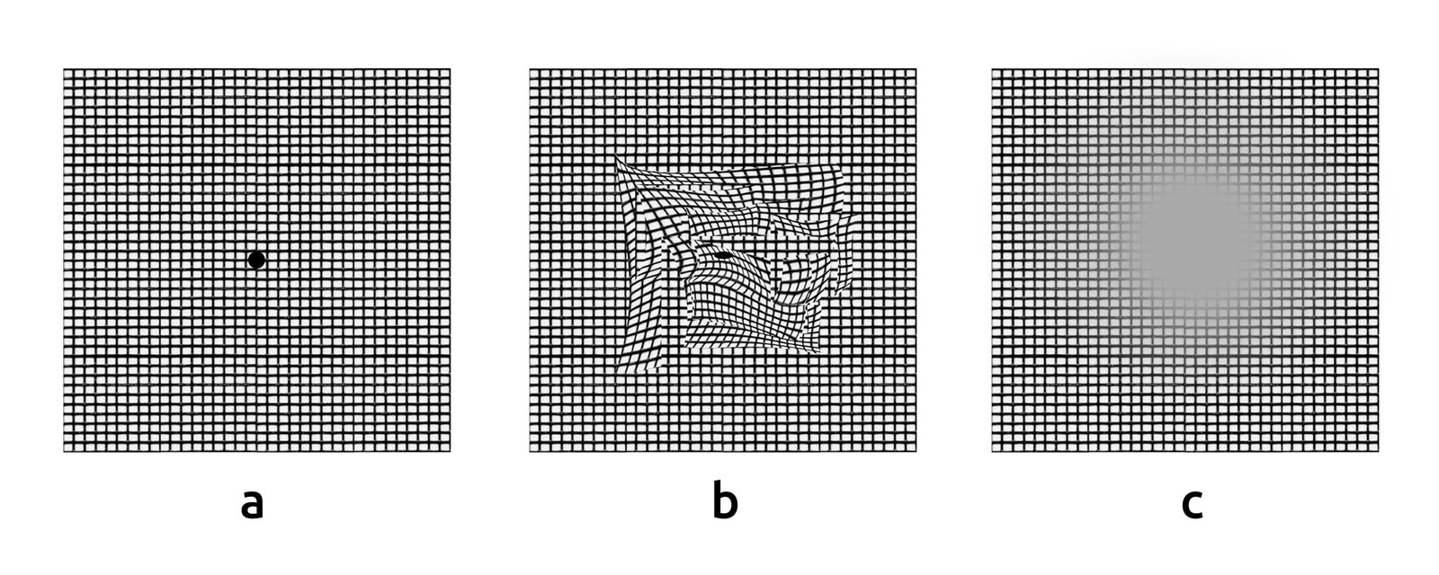 - Metamorphopsia: type of visual distortion in which straight lines appear wavy, which can be tested for using an Amsler grid