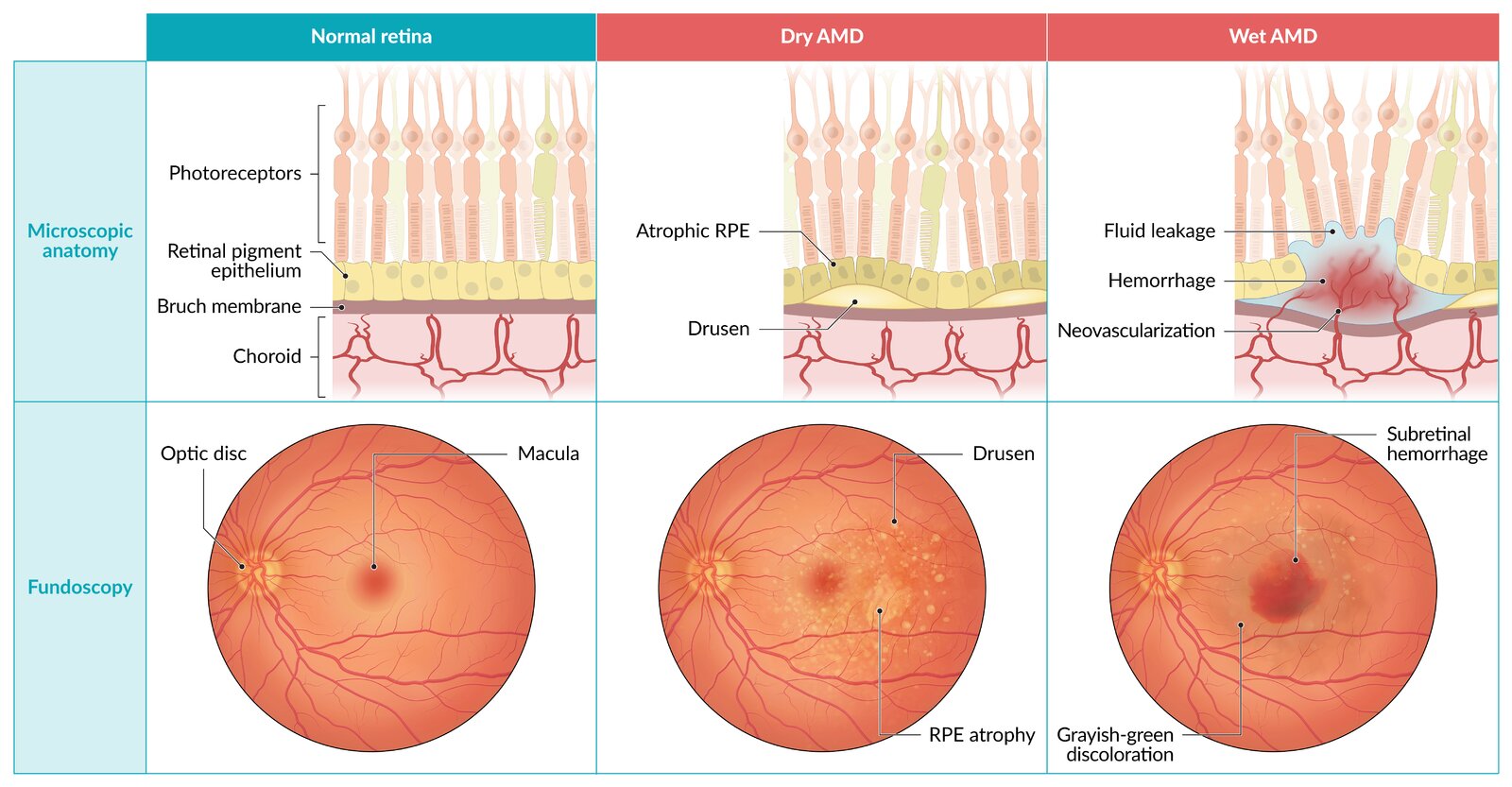 AMD is characterized by progressive degenerative changes in the central part of the retina (macula) → visual impairment.