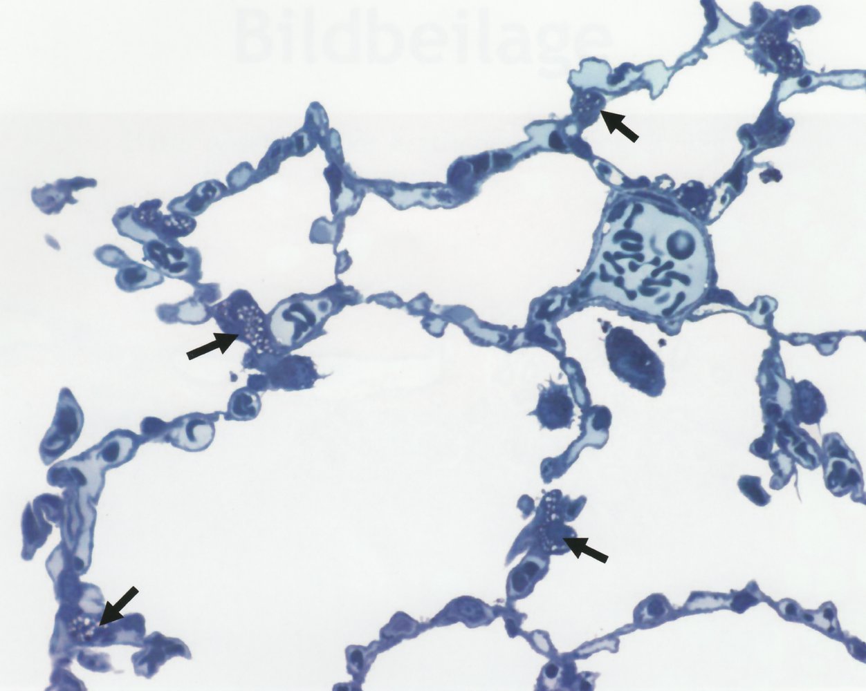 - Alveolar macrophages phagocytose fine dust particles (< 2 Ξm)