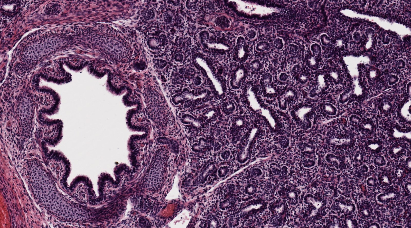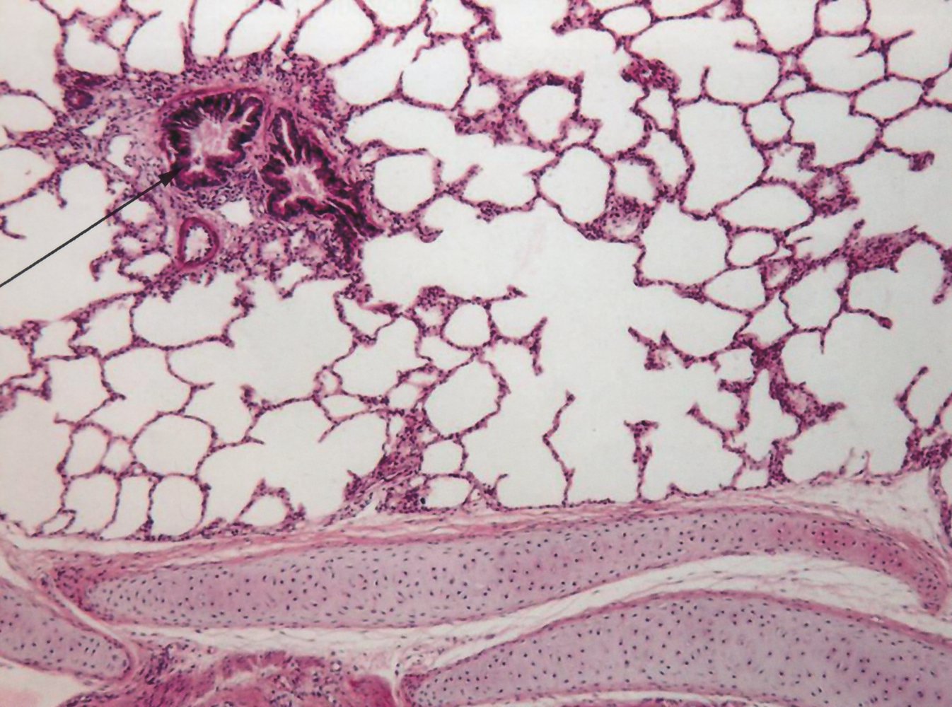- Bronchioles: simple ciliated columnar epithelium; enclosed by smooth muscle