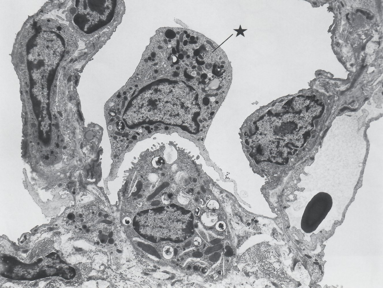 - Presence of hemosiderin-laden macrophages (or heart failure cells) may be a sign of pulmonary edema or alveolar hemorrhage (from pulmonary infarction, vasculitis, or aspiration of blood).