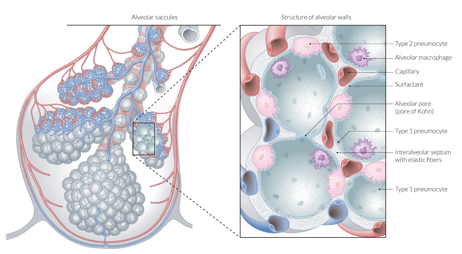 Pulmonary alveoli are separated from each other by the interalveolar septum with elastic fibers and capillaries. Interalveolar pores connect adjacent alveoli.