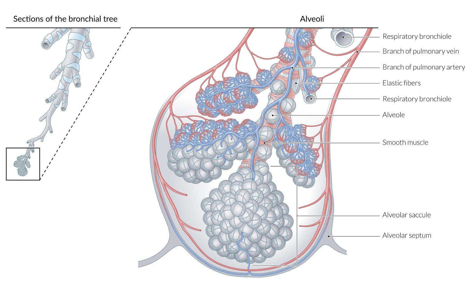 - Alveolar sacs, which contain several pulmonary alveoli surrounded by capillaries