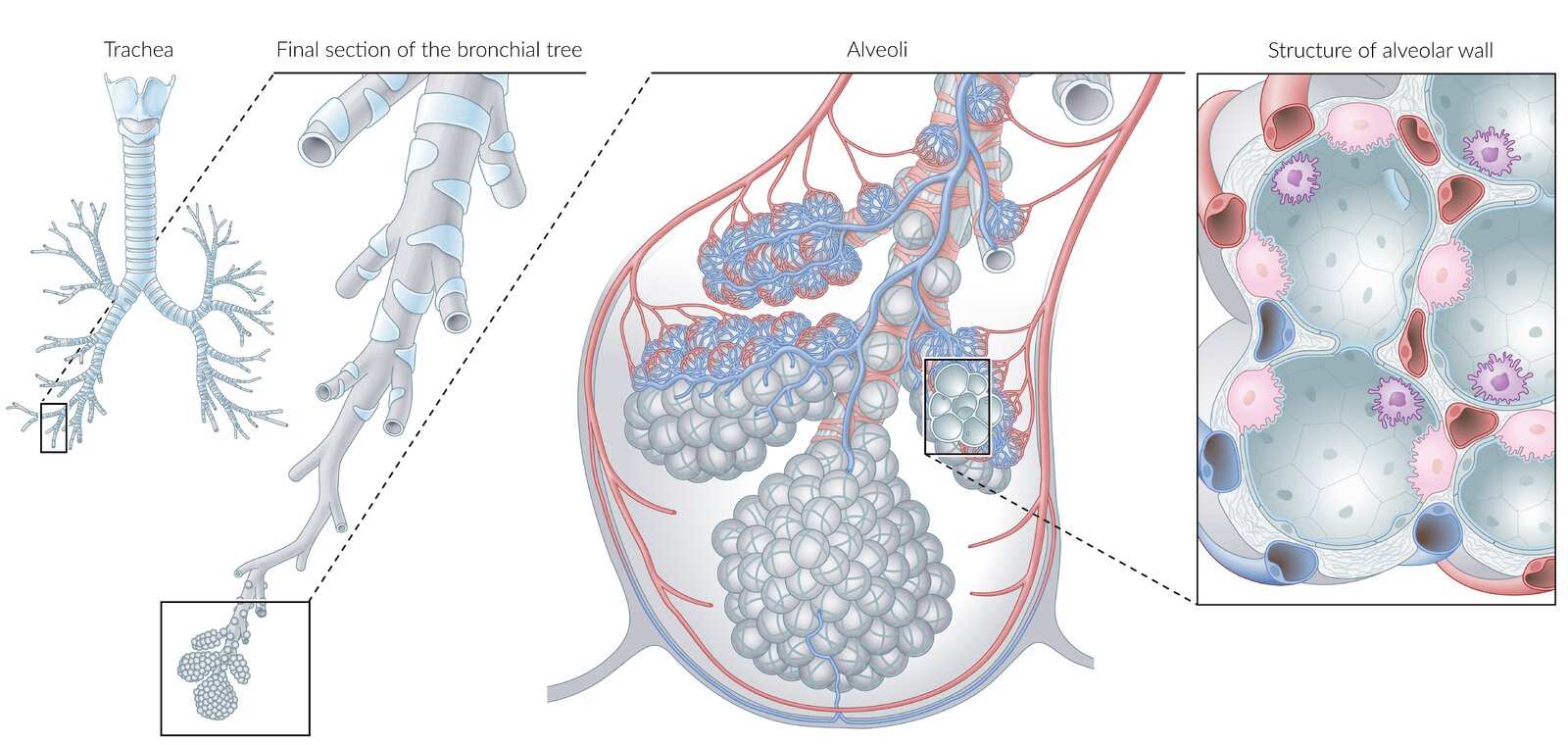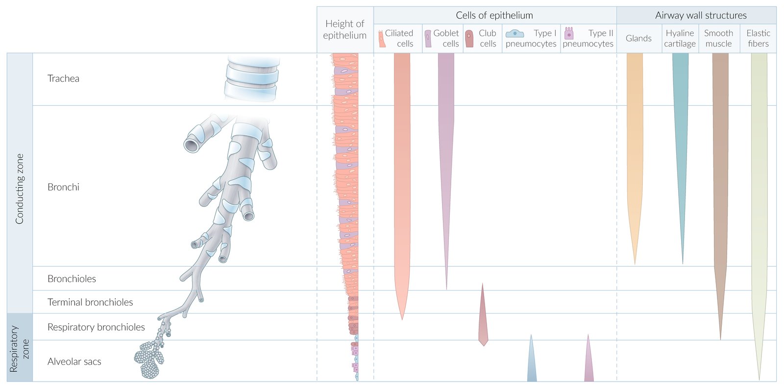 - Respiratory zone: lung parenchyma (site of O2 and CO2 exchange)