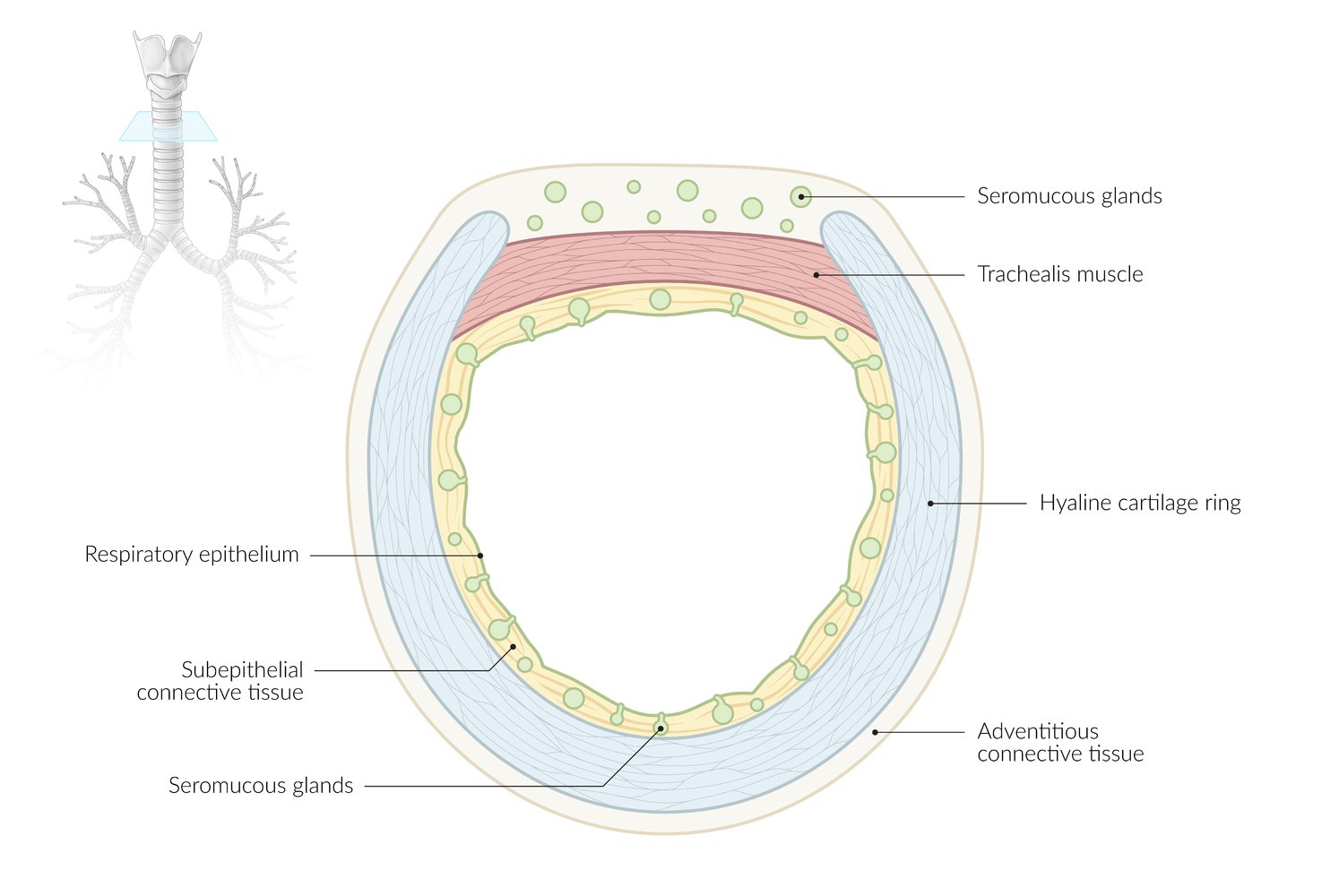 - Cartilage: C-shapedhyaline cartilage rings in the trachea and hyaline cartilage plates in the bronchi provide structural support.