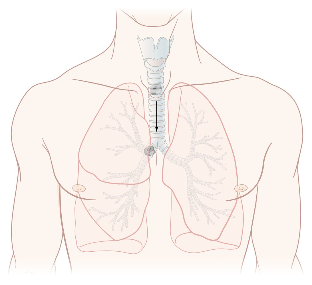 - Bifurcates at the level of T4 into the left and the right main bronchus (tracheal carina)