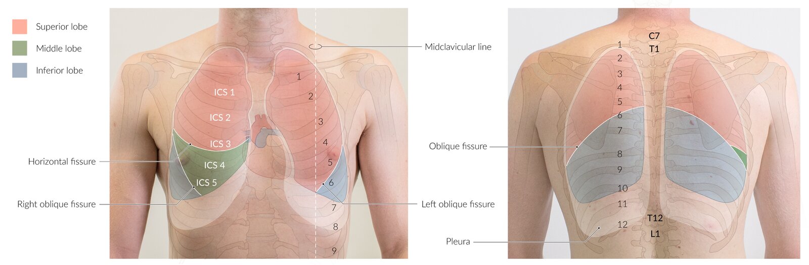 Only the right lung has a middle lobe. It can be auscultated in the fourth to six intercostal space anteriorly at the midclavicular line.