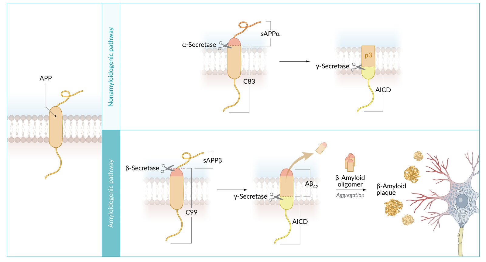 - Enzymatic cleavage of transmembranous APP by β-secretase and γ-secretase → Aβ peptide aggregation → formation of insoluble plaques → neurotoxic effect
