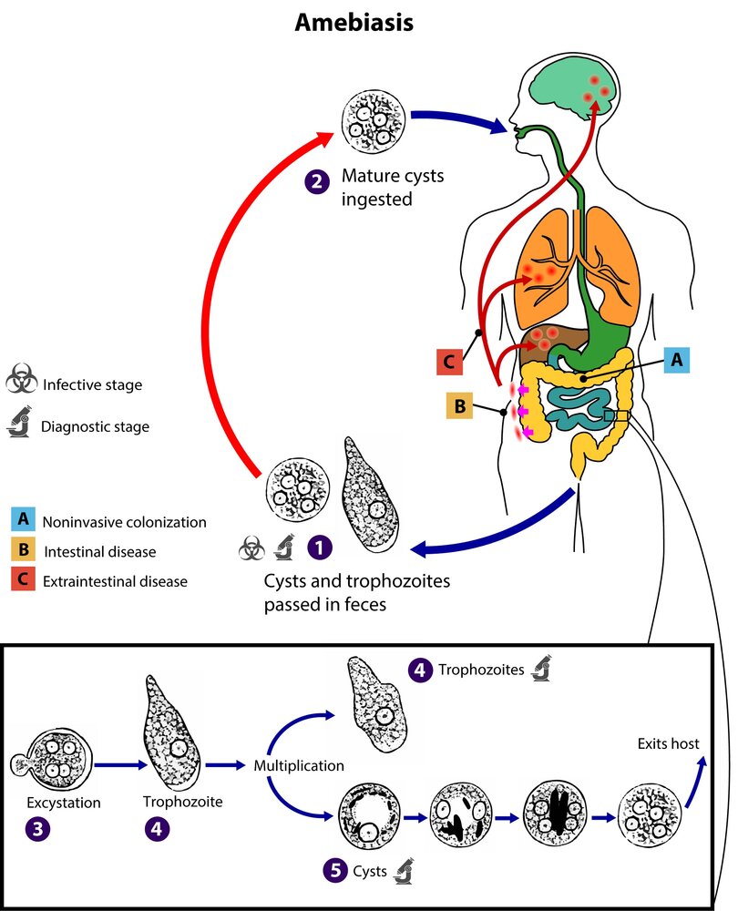 - Amebic cysts are excreted in stool and can contaminate drinking water or food