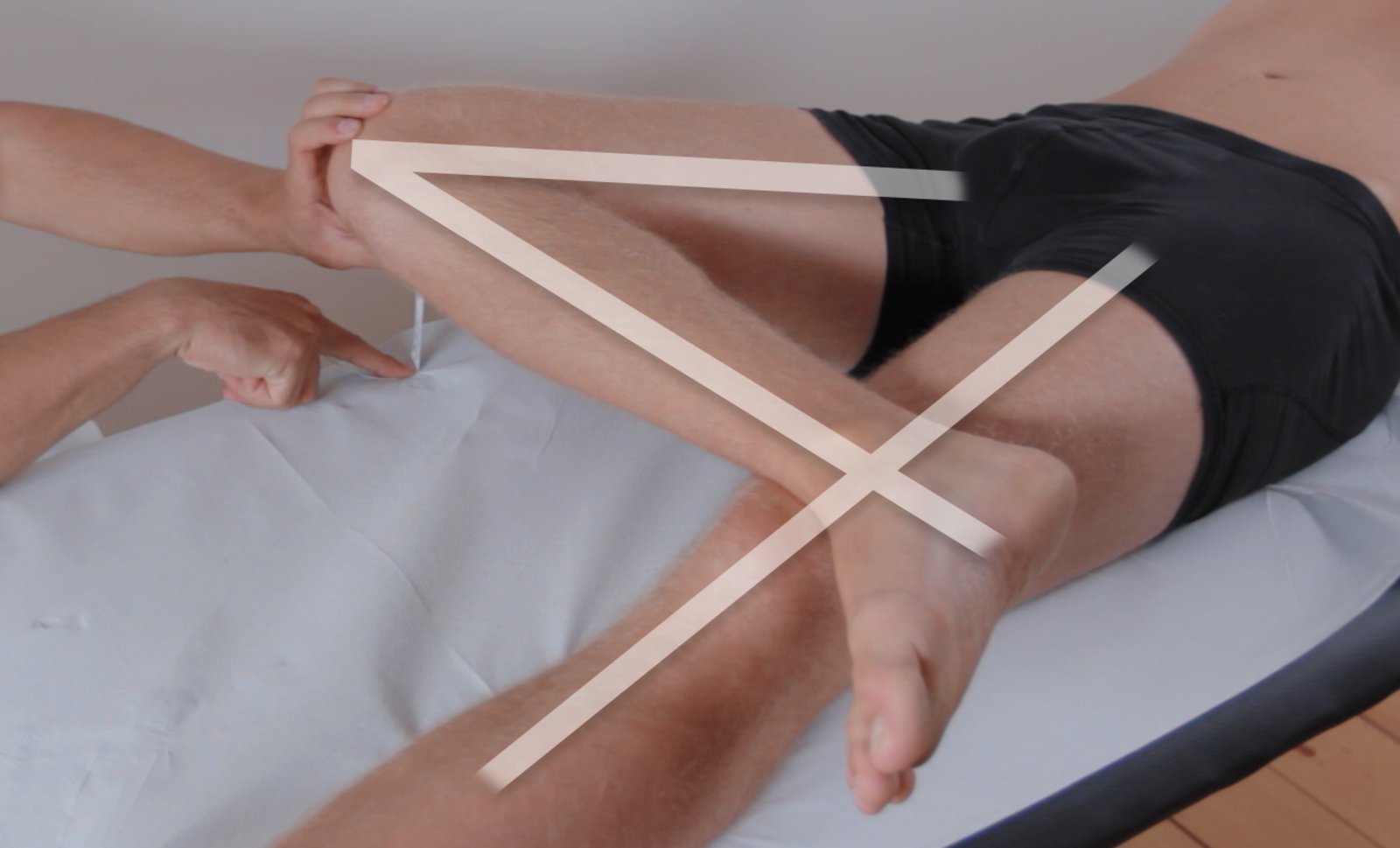 - Lift the upper leg and extend the upper hip with one hand while fixing the pelvis with the other hand.