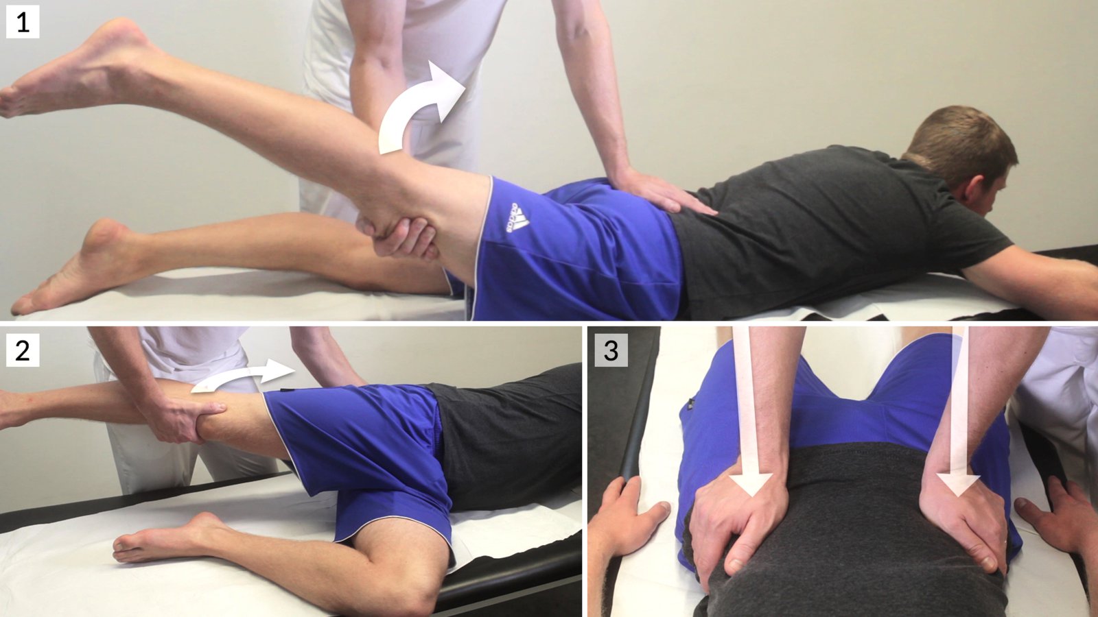 - Prone position: Lift the leg passively (i.e., extend the hip) with one hand while applying pressure on the ipsilateral SIJ with the other hand.