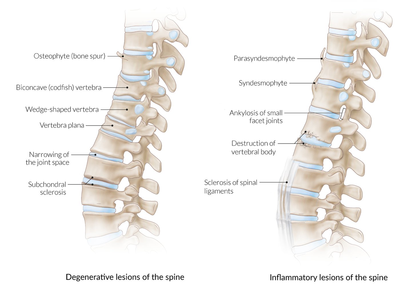 - Vertical formation of syndesmophytes along the spinal ligament or around the annulus fibrosus of the intervertebral discs (see “Syndesmophytes vs. osteophytes”)