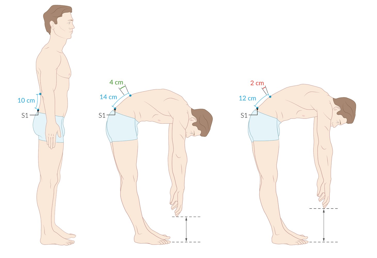- An increase of < 4 cm between the two points suggests impaired spine flexion.