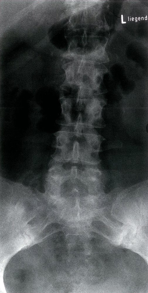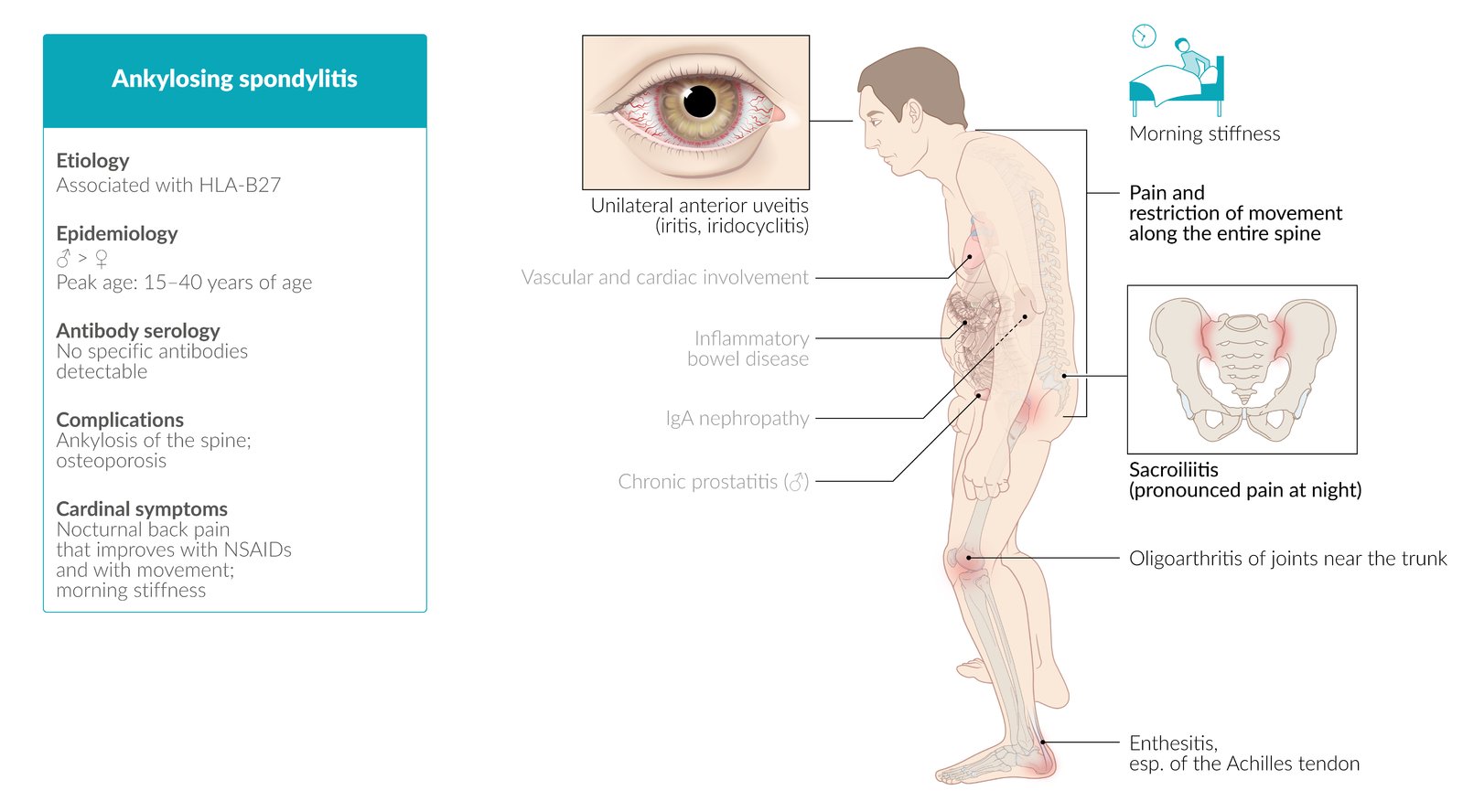 - Symptoms of axial spondyloarthritis with inflammatory changes in the sacroiliac joints and spinal ankylosis seen on plain radiographs