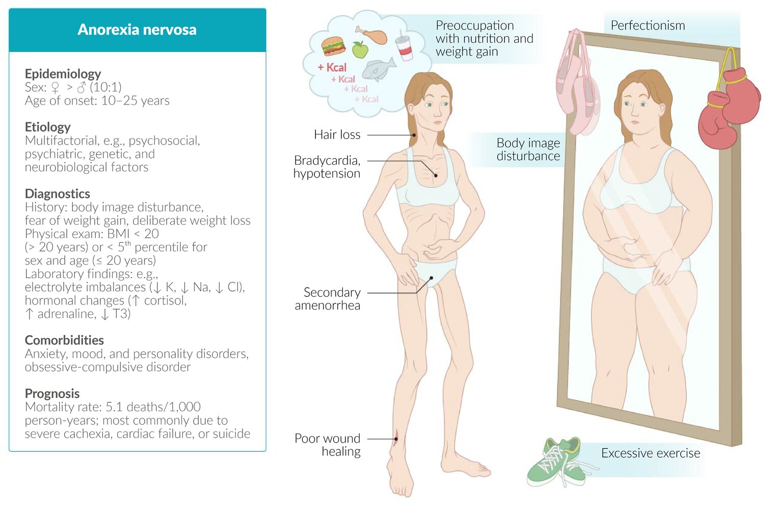 Anorexia nervosa (AN) is a complex eating disorder with a high mortality rate. It is characterized by deliberate restriction of energy intake, resulting in significantly low body weight. Causes are multifactorial and include genetic factors, psychiatric disorders, and psychosocial factors (e.g., trauma). Typical features include body image disturbance and fear of weight gain. There are two subtypes of AN: restrictive (weight loss is achieved by reducing intake and increasing calorie expenditure, e.g., with excessive exercise) and binge eating/purging (if those behaviors are present). Individuals without low body weight but who otherwise meet the diagnostic criteria for AN are diagnosed with atypical AN. It is important to assess for malnutrition severity in affected individuals, regardless of body weight or body mass index (BMI). Diagnostic workup should include evaluation for associated complications (e.g., electrolyte abnormalities) and, in some cases, any underlying conditions that may affect weight or cause a change in eating behaviors (e.g., thyroid disorder). Management should be provided in an outpatient setting if possible, but the presence of red flags in eating disorders may indicate the need for hospitalization for acute stabilization. All patients should be referred for psychotherapy and nutritional management for weight restoration in AN. Pharmacotherapy may be used as adjunctive therapy to help manage comorbid psychiatric conditions (e.g., depression) or promote weight gain in selected patients. AN has the highest mortality rate of all psychiatric disorders because of the high incidence of serious medical complications.