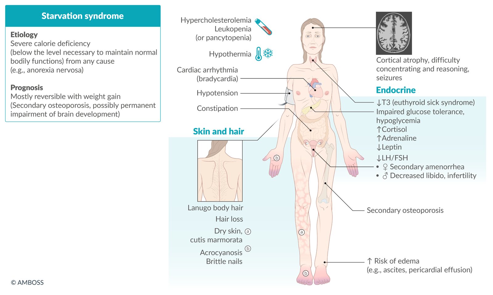 - Malnutrition can cause long-term physical complications, e.g., stunted growth, secondary osteoporosis (see βClinical features of ANβ).