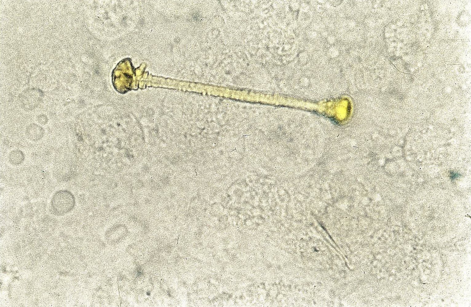 - Dumbbell-shaped, golden-brown fusiform rods surrounded by an iron protein coat [3]