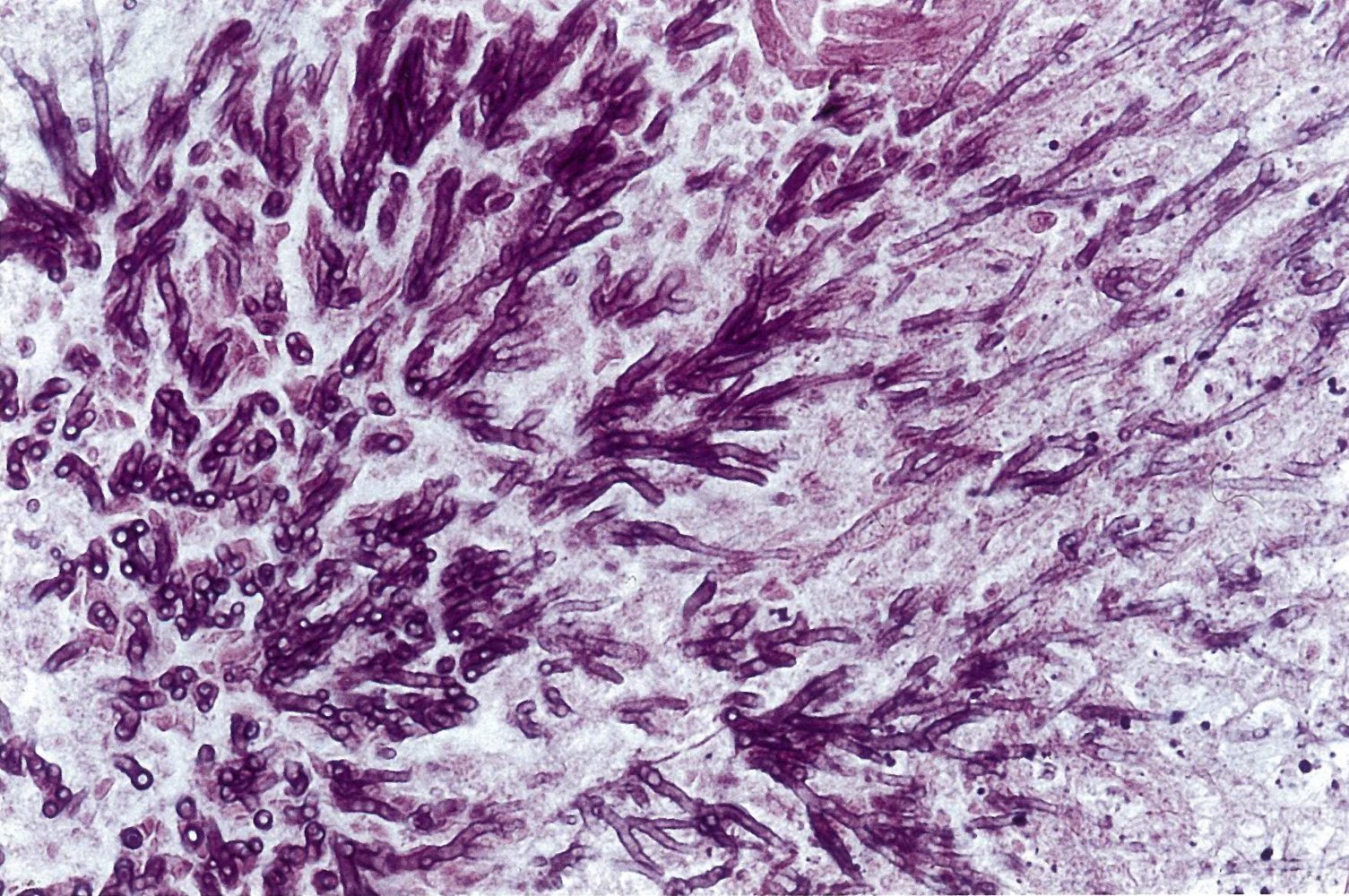 - Staining: Gomori methenamine silver stain or periodic acid-Schiff stain