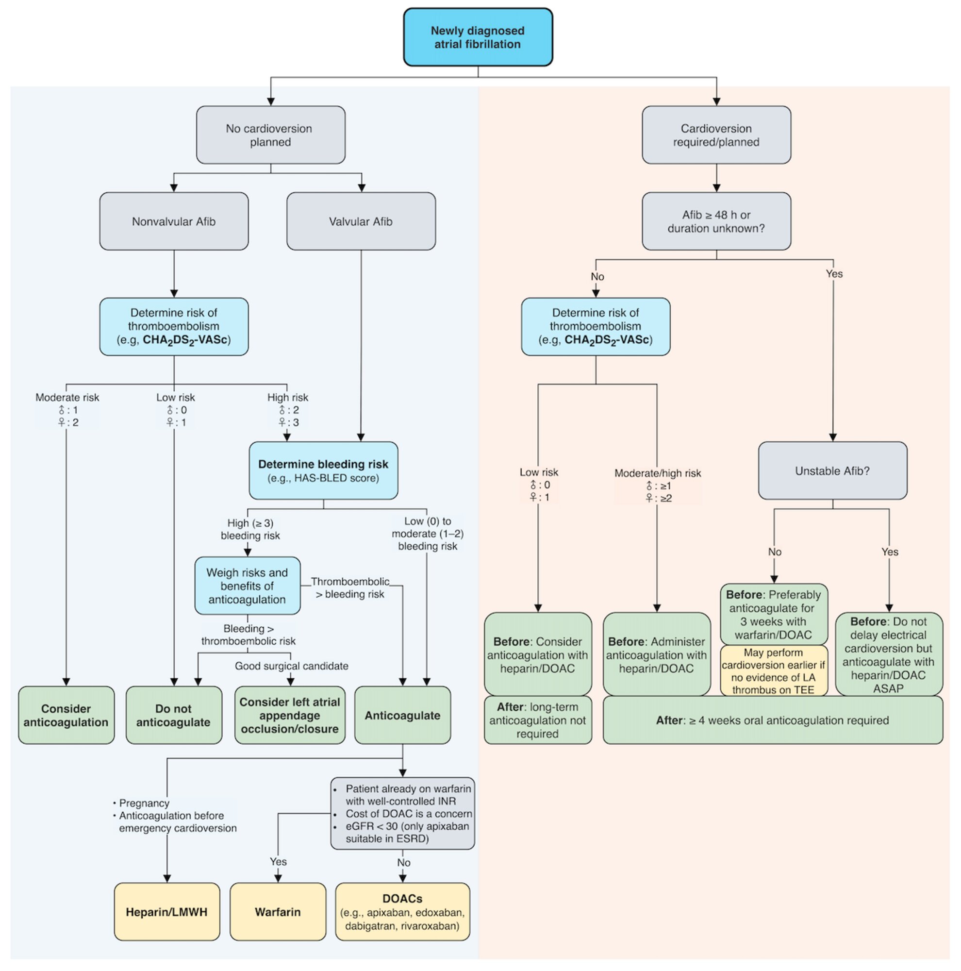 - Anticoagulation with heparin or a DOAC for Afib with onset β₯ 48 hours or unknown, valvular Afib, or high-risk CHA2DS2-VASc score