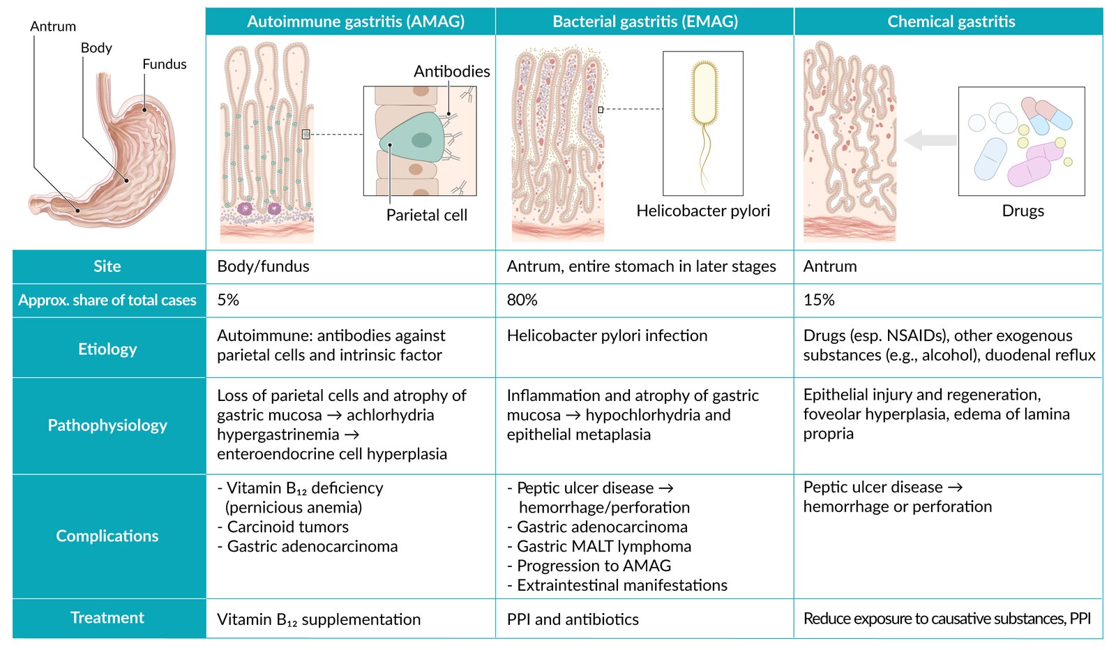 Atrophic gastritis is a condition characterized by chronic inflammation of the gastric mucosa with atrophy, gland loss, and metaplastic changes. There are two types: autoimmune atrophic gastritis (AIG) and environmental metaplastic atrophic gastritis (EMAG), which is commonly caused by Helicobacter pylori. Patients with atrophic gastritis are often asymptomatic or may only experience nonspecific discomfort in the epigastric region. Important diagnostic steps include gastroscopy with biopsy and laboratory studies (e.g., gastrin). Treatment includes H. pylori eradication therapy, iron and vitamin B12 supplementation, and symptomatic treatment of dyspepsia, e.g., antacids. If left untreated, atrophic gastritis may lead to peptic ulcer disease or result in the development of various cancers.