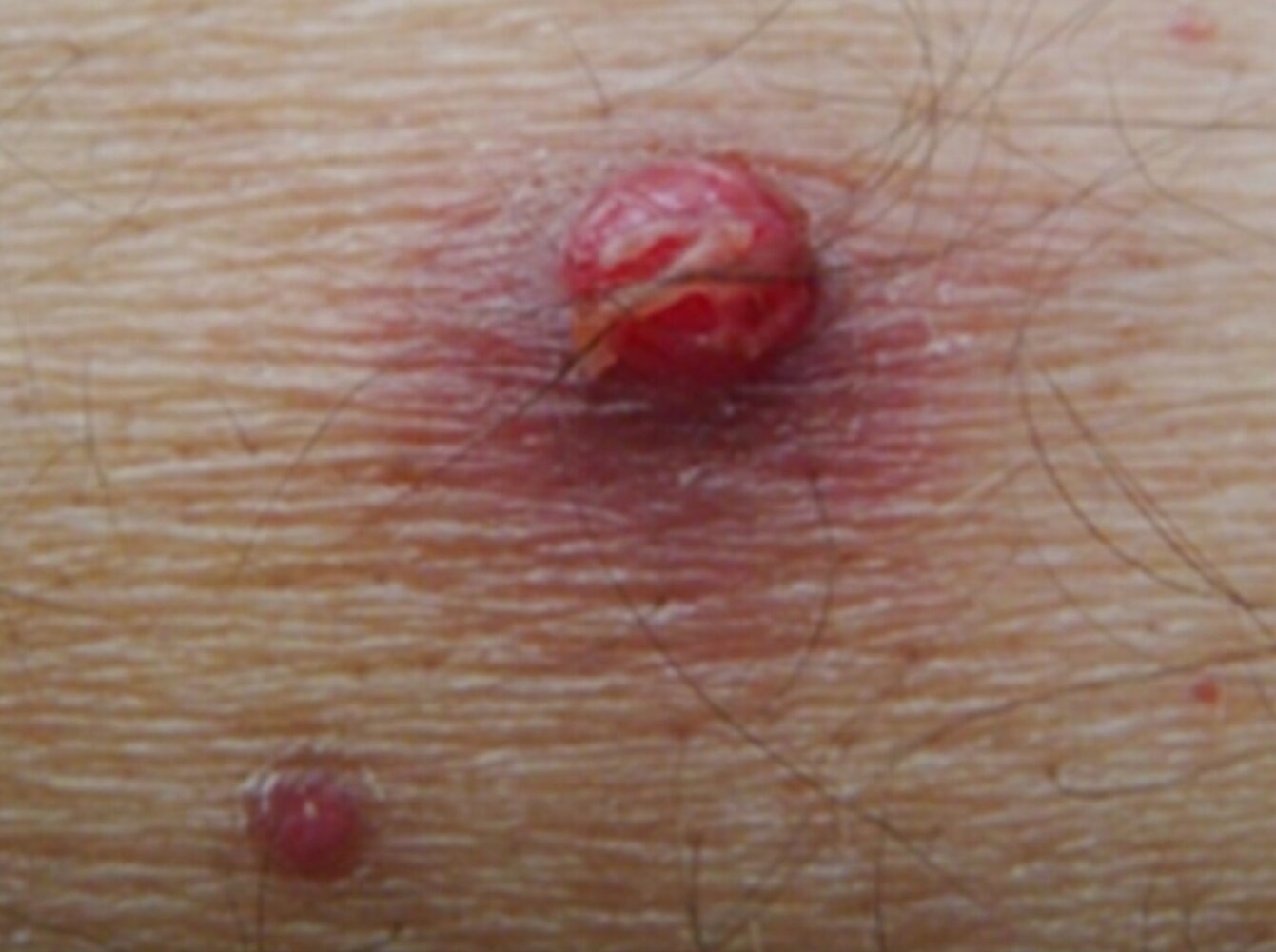 - Solitary or multiple, red, flesh-colored or colorless papules and nodules that bleed easily